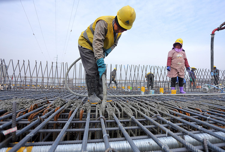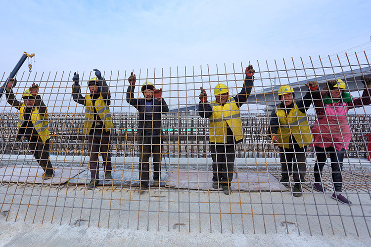 圖為工人們?cè)阡佋O(shè)鋼筋網(wǎng)片,準(zhǔn)備橋面鋪裝施工