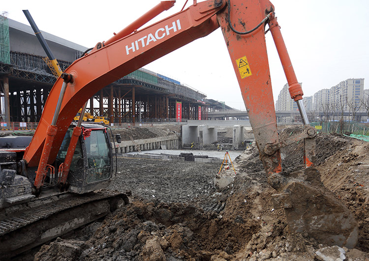 圖為黃海路地面道路下穿新長(zhǎng)鐵路箱體已頂進(jìn)到位