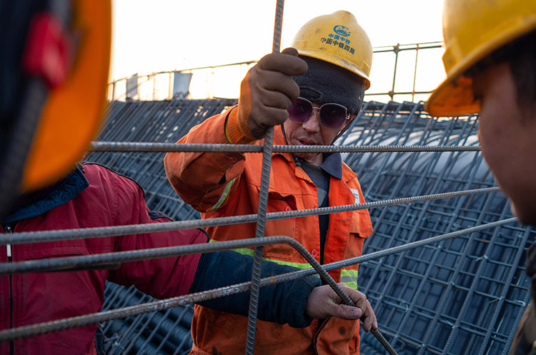 圖為現(xiàn)場工人正在進(jìn)行匝道現(xiàn)澆梁鋼筋施工的鏡頭。